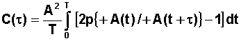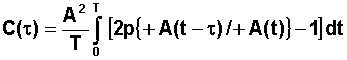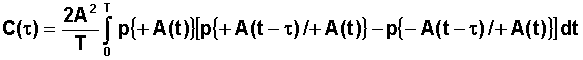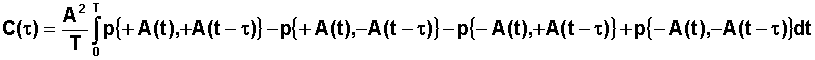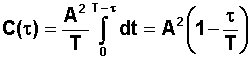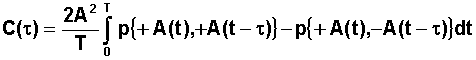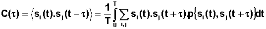 Le signal étant périodique, il suffit de calculer la moyenne sur une période, et de calculer toutes les occurences possibles du produit Si(t) à l'instant t avec Sj(t+t) à l'instant t+t, associé à la probabilté de trouver Si(t) à un instant t dans la période T soit dt / T et de moyenner sur une période, ce qui se traduit par :